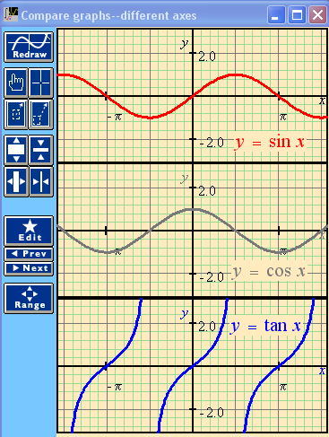 ![]() This type of graph allows the student to compare functions on different axes, lined up vertically. This example compares the three most basic trigonometric functions. Can you see from the graphs how it makes sense that tan x = (sin x) / cos x? |